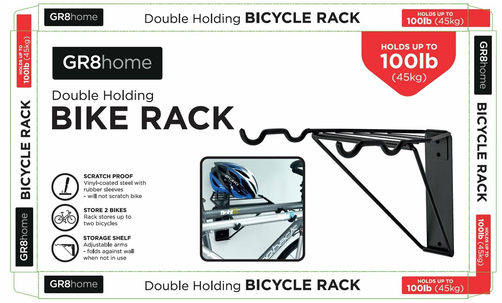 These Wall Mountable Cycle Storage racks are the ideal storage solution for your bicycles. They can be fixed onto the wall to provide a convenient, space saving method of storing upto 2 bicycles. Features a convenient shelf for storing cycling gear like helmet, pads etc. Adjustable arms fold against the wall when not in use.
