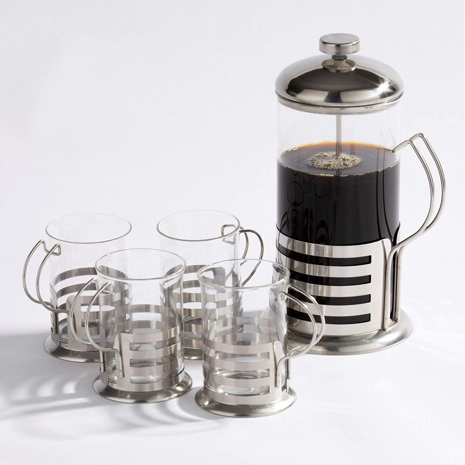 Make delicious, aromatic coffees the easy way with the large 1 litre capacity French press. Undeniably stylish, made from glass with an on-trend Silver finish stainless steel frame and handle. Also suitable for brewing tea. Great for use in the home, office or taking on your travels – easy to hand wash for no-fuss cleaning. Cafetiere holds 700ml (4 cup) and has a stainless steel filter and body and made with glass. Cups hold up to 200ml and have a stainless steel body and made with glass. Great for personal use or even as a gift.