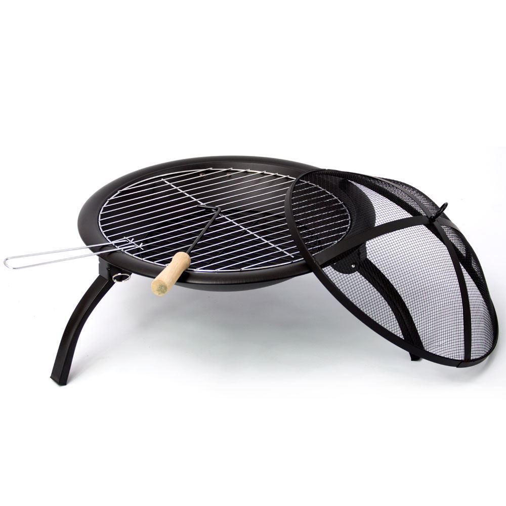 Beautifully crafted traditional steel fire pit for use as centre piece fire pit, heater, BBQ grill. Includes a spit guard and poker for maximum protection. Size is 54 x 54 x 41cm, Cooking Grid: 50cm Chrome plated, Mesh Lid: 48 x 15.5cm. Features 3 legs which are foldable for easy storage and transportation. Perfect for camping, gardens, Patio, outdoor gatherings.