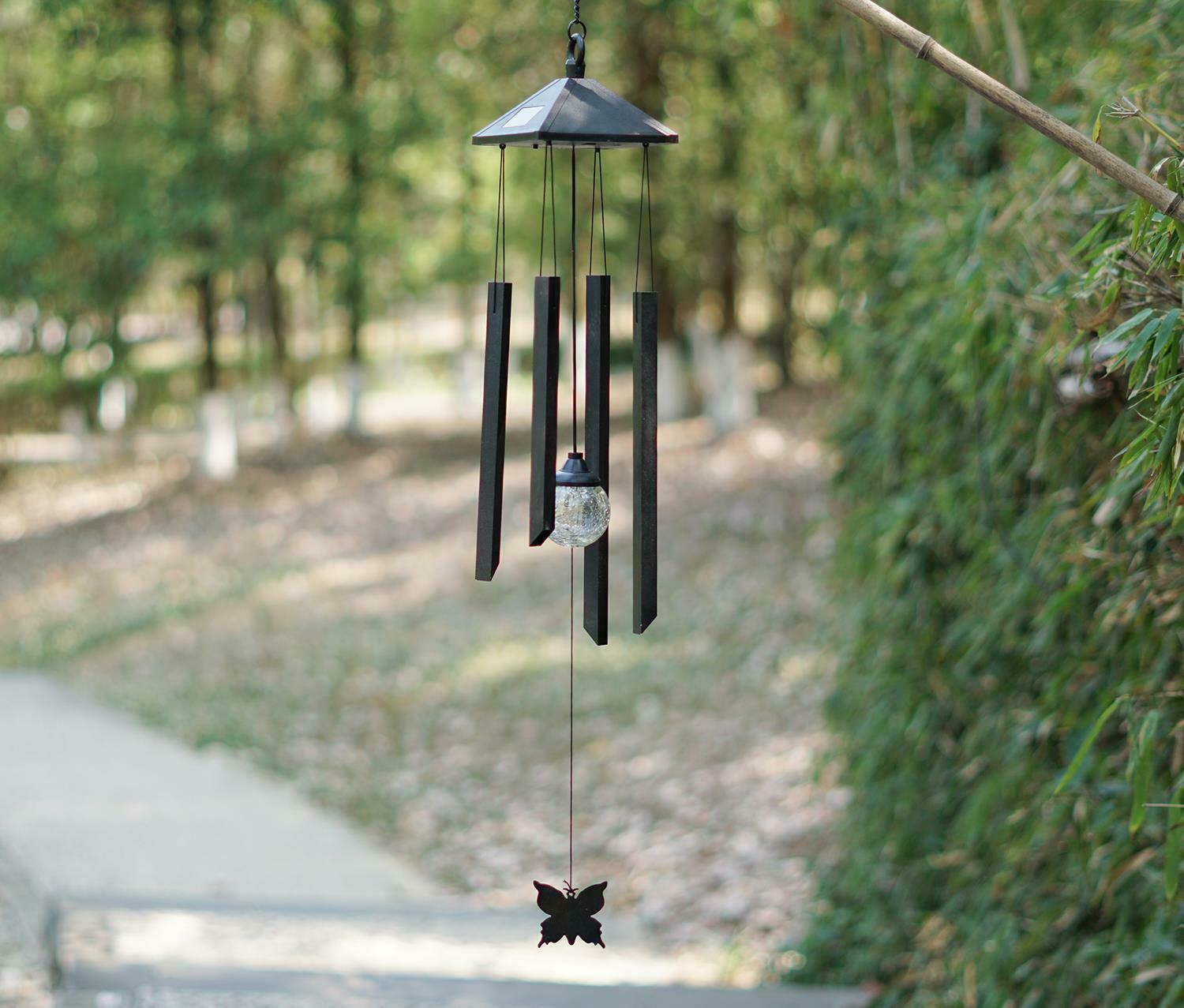 These Wind Chimes with Solar Powered Colour Changing LED Light would make a unique and attractive addition to your garden. The colour changing glass ball lights up at night to illuminate the chimes giving a stunning effect.
