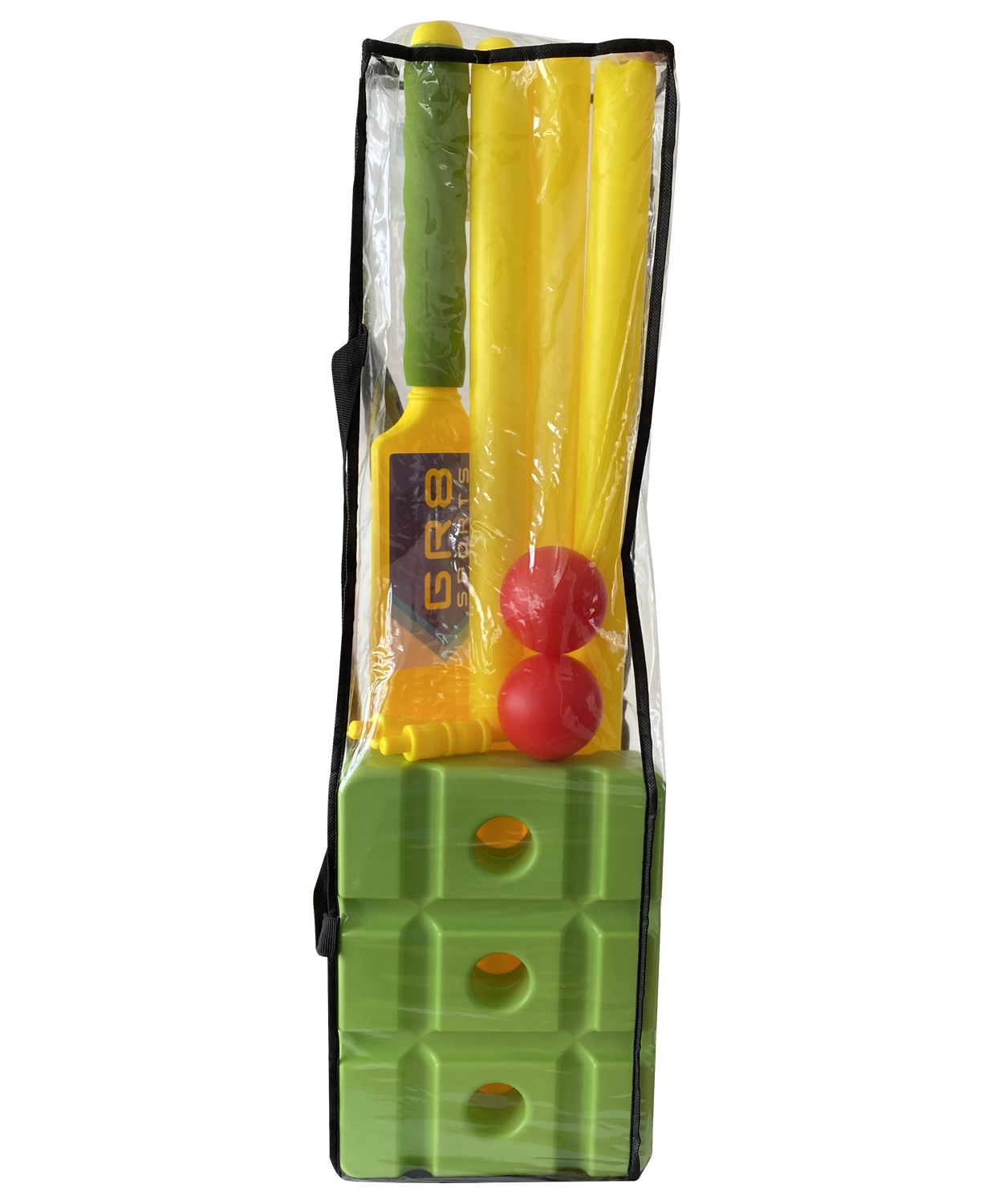 Cricket set with everything you need; plastic bat, 3 stumps, 1 stump base, 2 bails and two cricket balls
