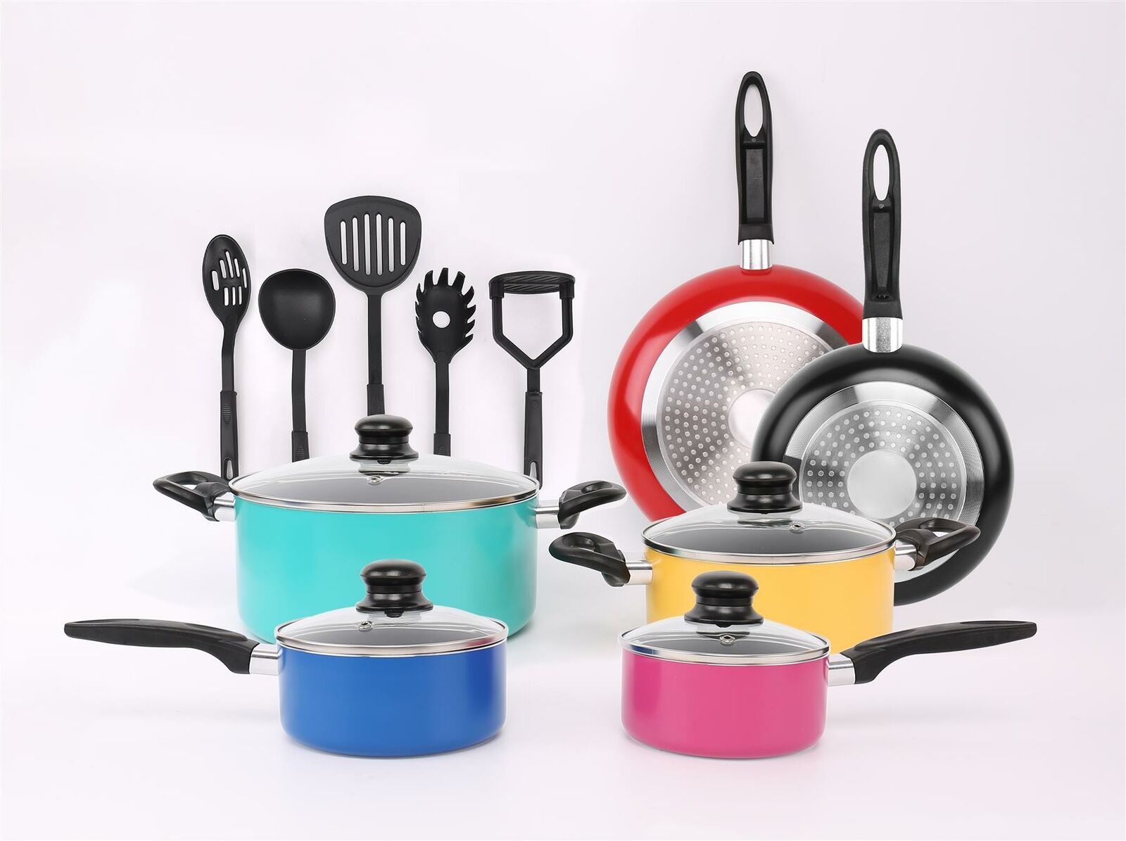 15-Piece Set: Gr8 Home 15-Piece Nonstick Cookware Set Includes Pink & Blue Sauce Pot, Yellow Cooking Pot, Green Dutch Oven Pot, Black Small Fry Pan, Red Medium Fry Pan, Slotted Spoon, Slotted Spatula, Lids, Pasta Server, Soup Ladle, & Potato Masher