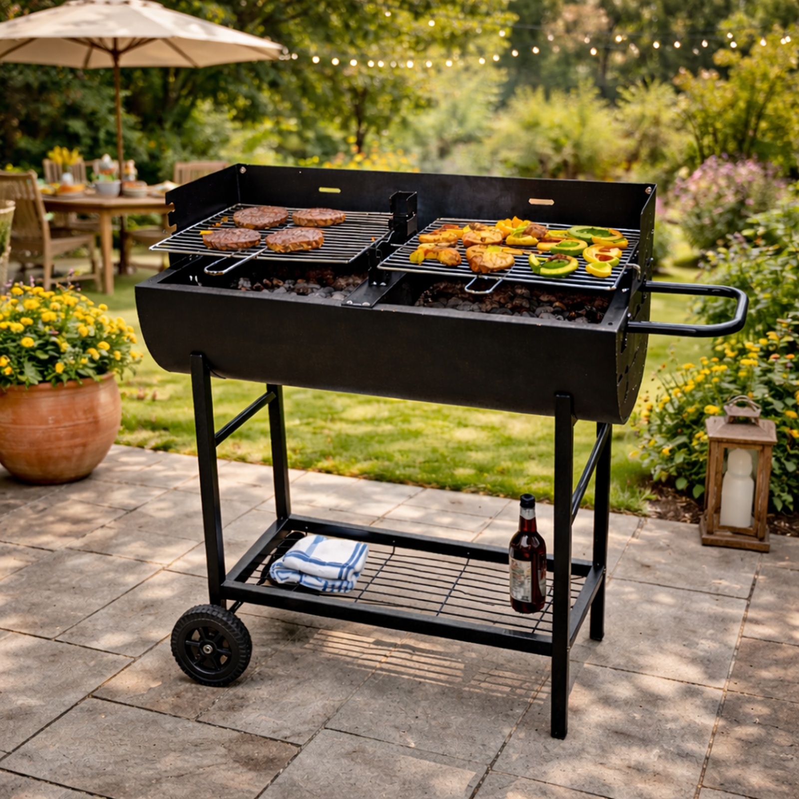 Charcoal BBQ Grill Half Barrel Dual Zone 2 Cooking Areas Garden Trolley BBQ Summary