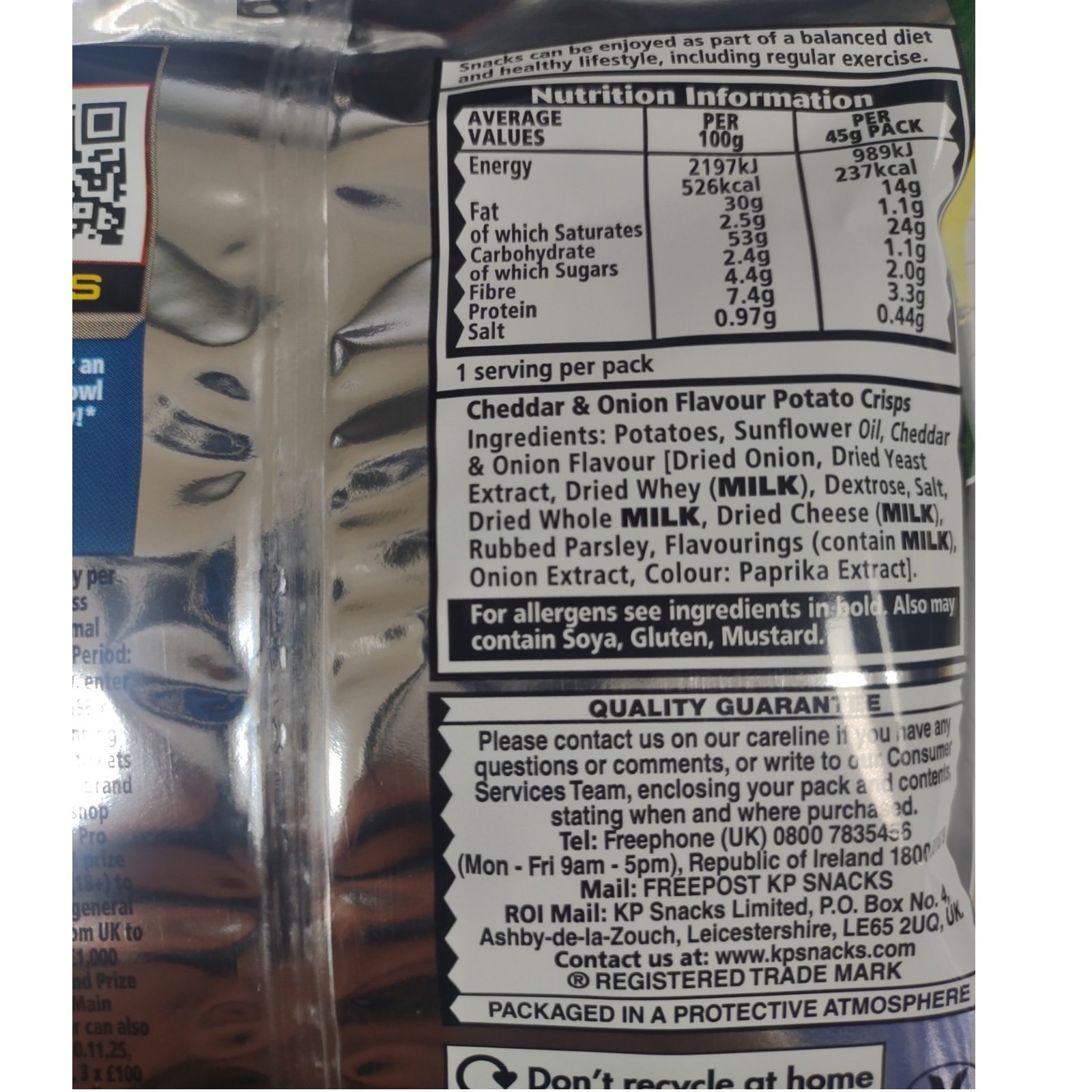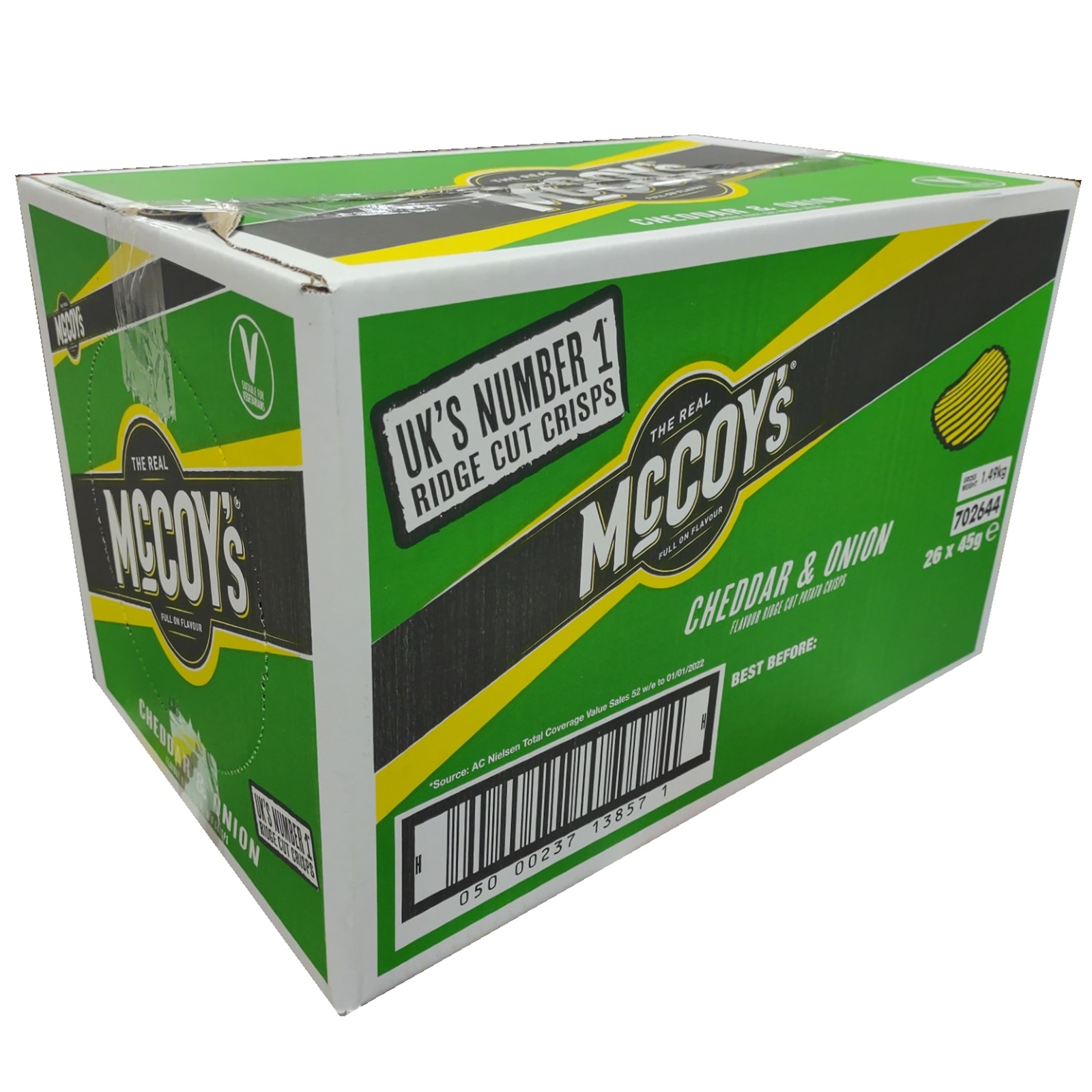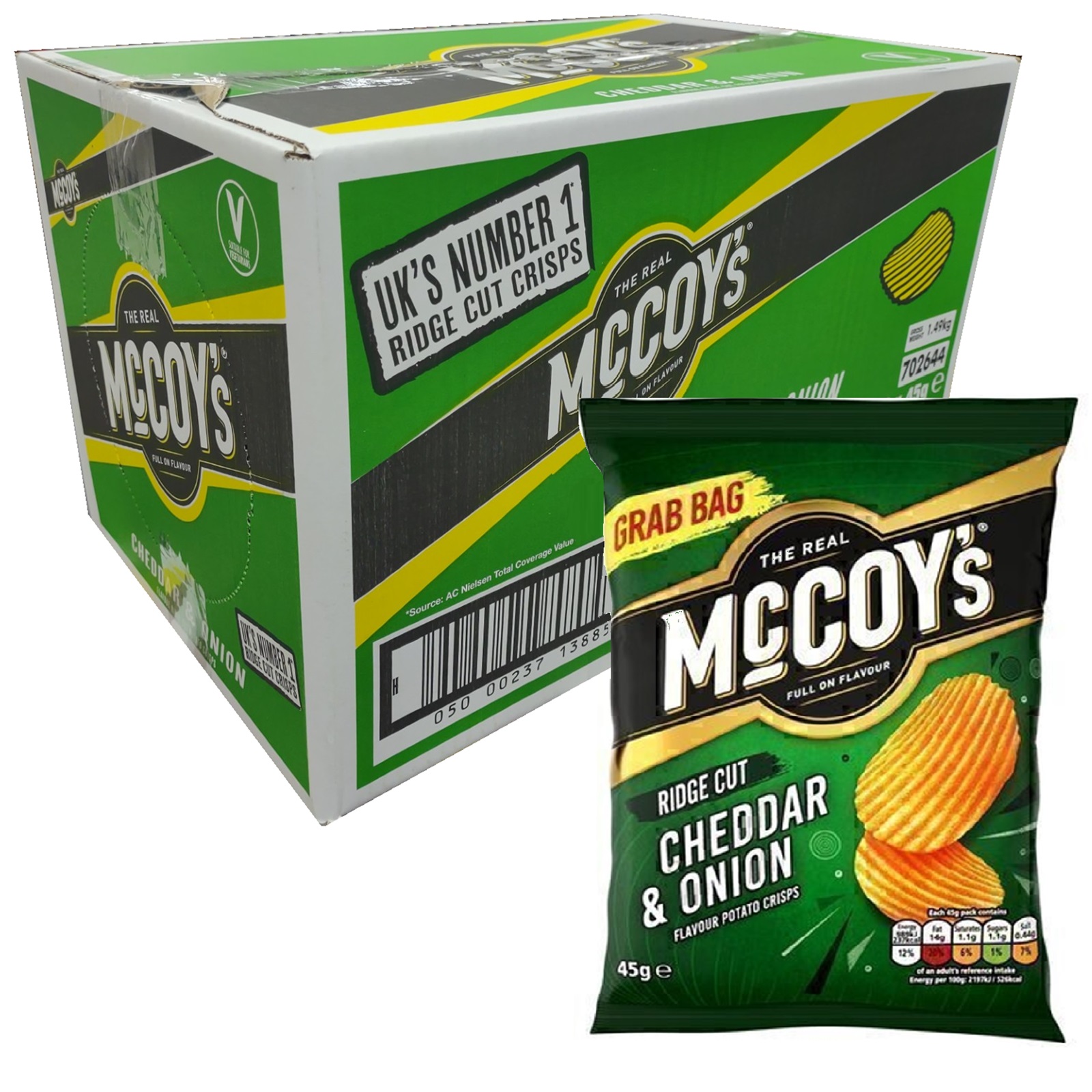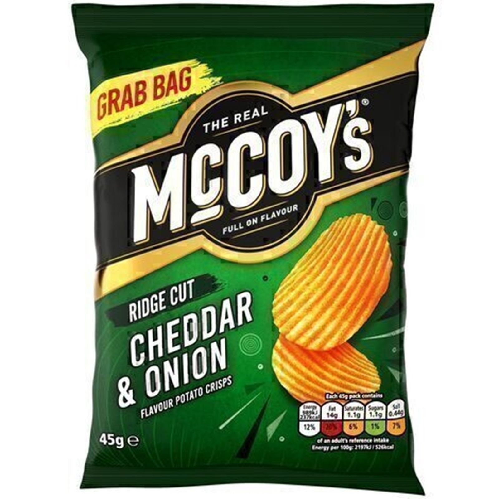 - McCoys Cheddar And Onion Potato Crisps Ridge Cut Box Pack of 26 x 45g Grab Bag