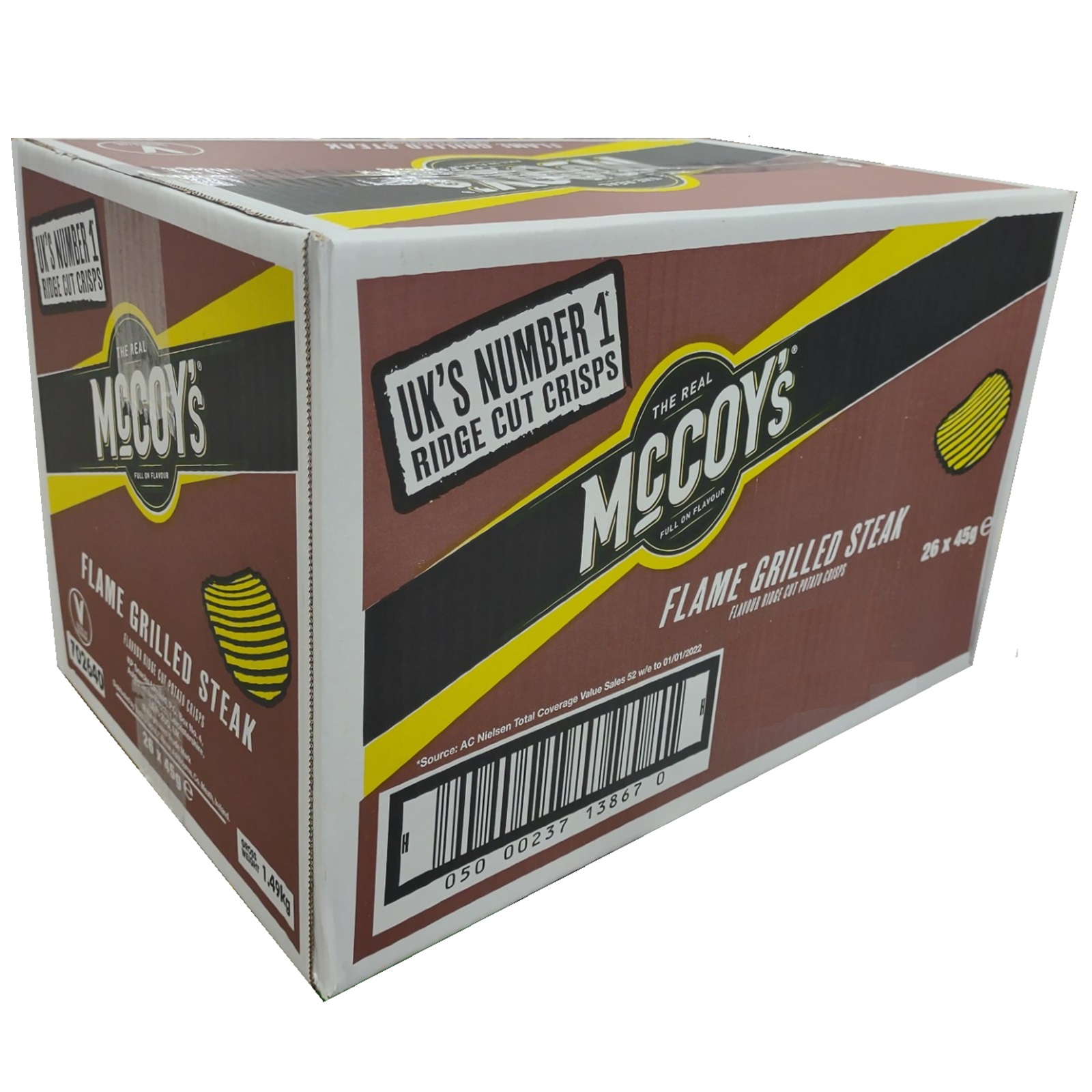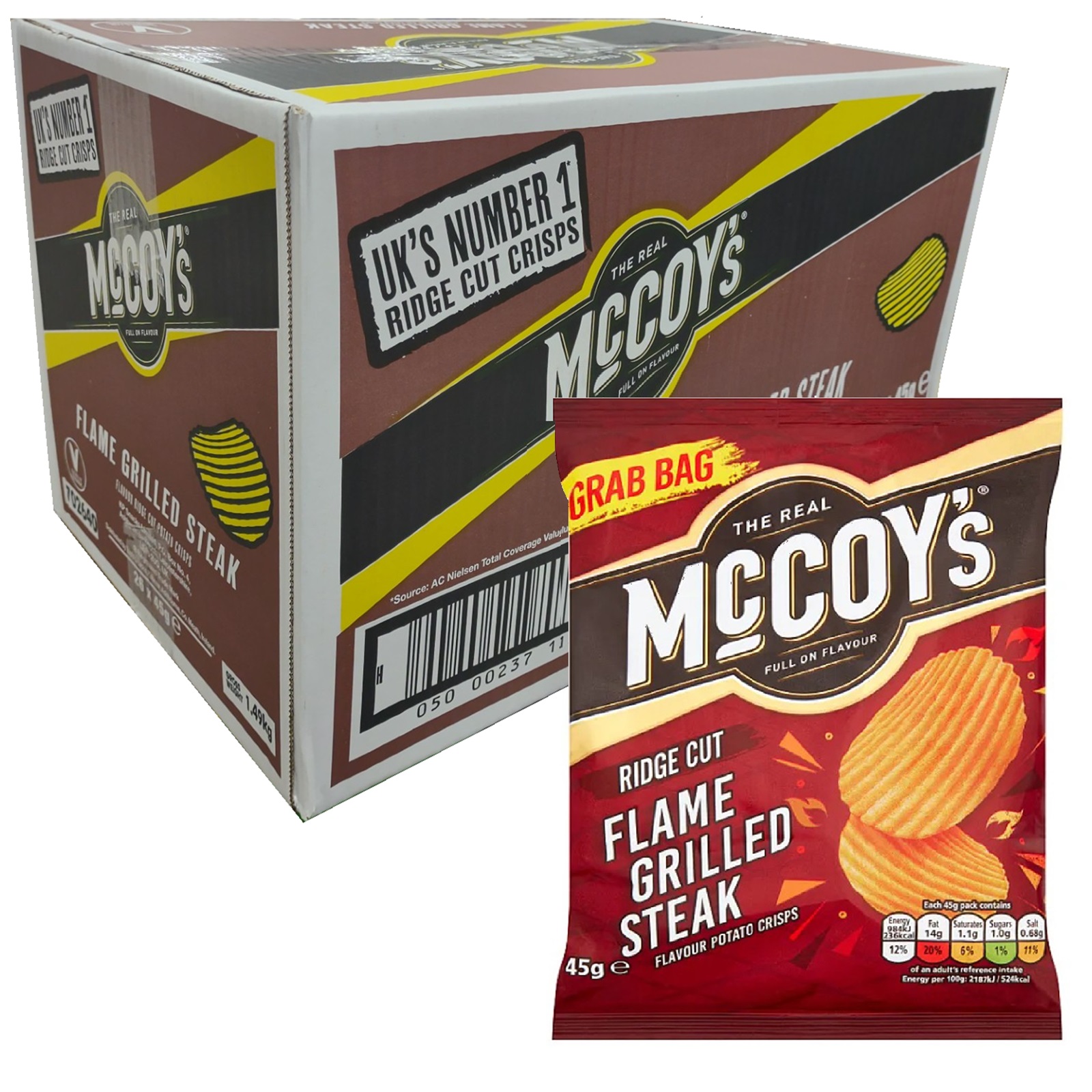 McCoys Flame Grilled Steak Flavour Potato Crisps Ridge Cut Box Case Pack of 26 x 45g Grab Bag