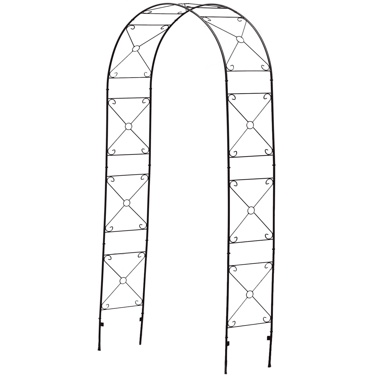 Free standing Garden Arch. Ideal for creating a stylish feature in your garden. Provides support of climbing plants. Legs insert into ground for added stability. Powder coated metal construction.