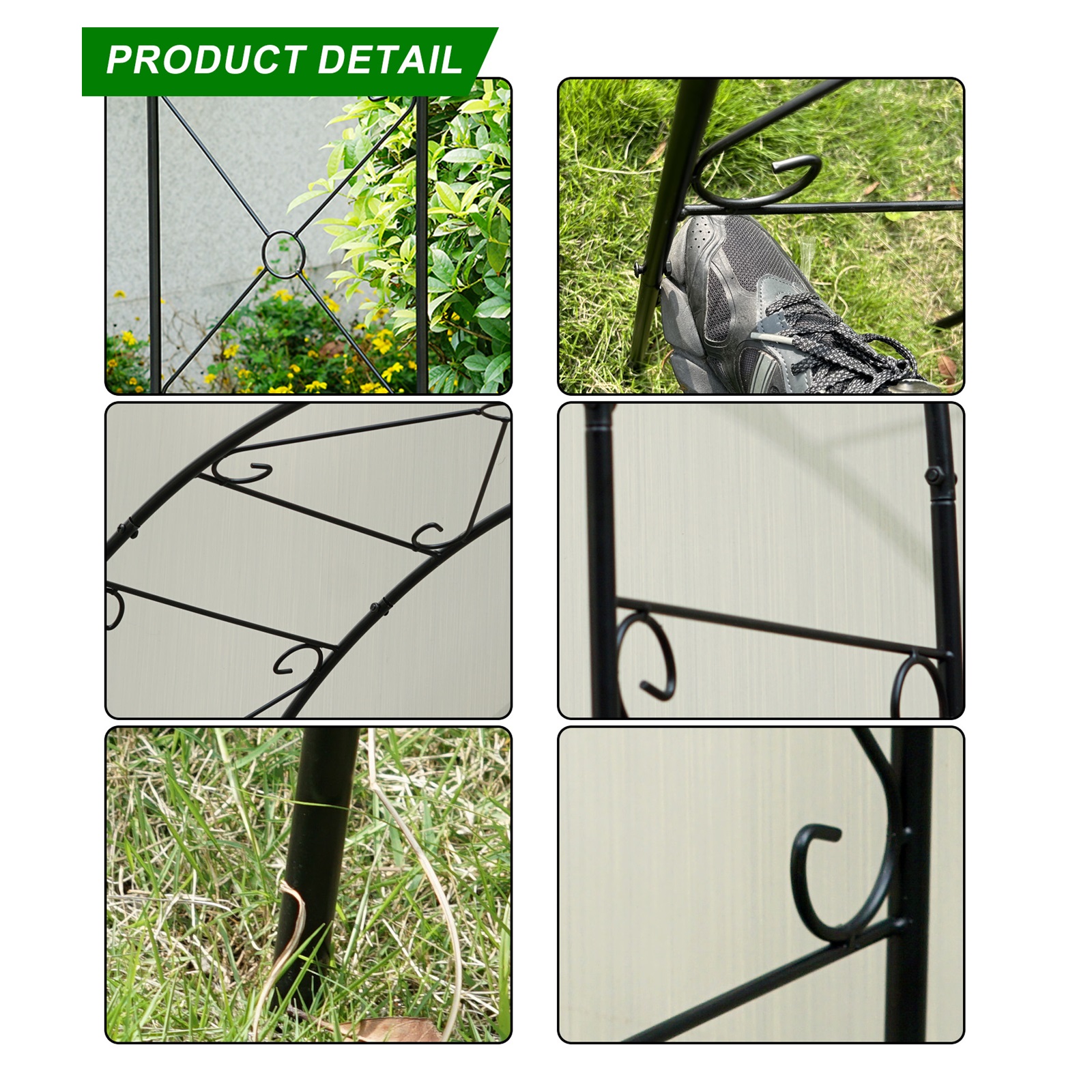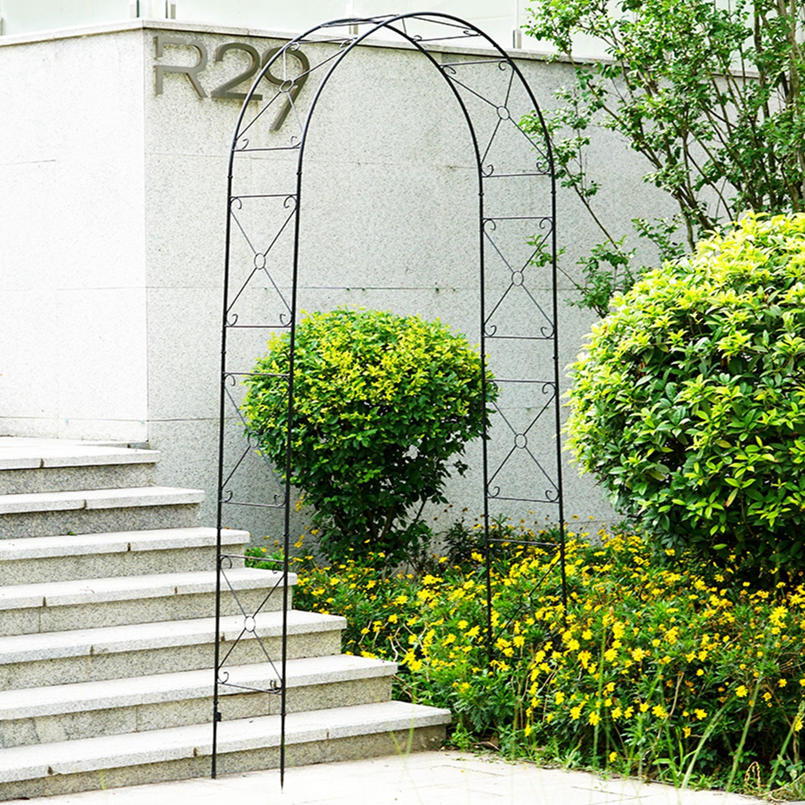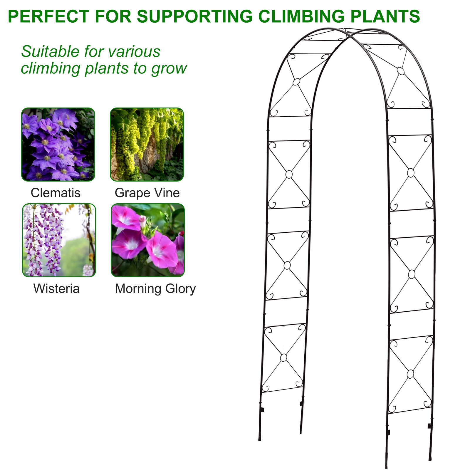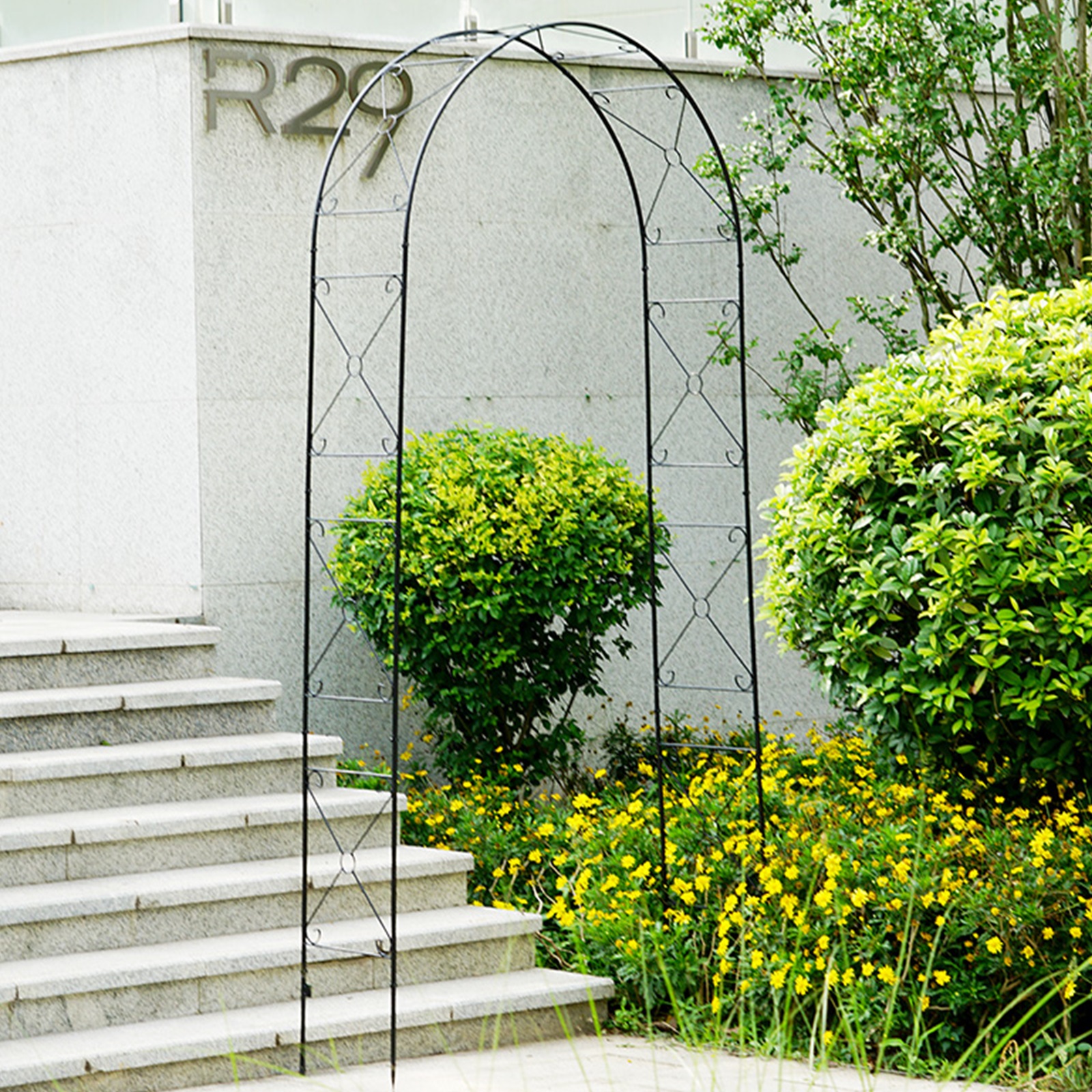 The metal garden arch is constructed of a heavy-duty powder-coated metal frame, which is rustproof, weatherproof, and deformation-resistant, ensuring long-term outdoor use.