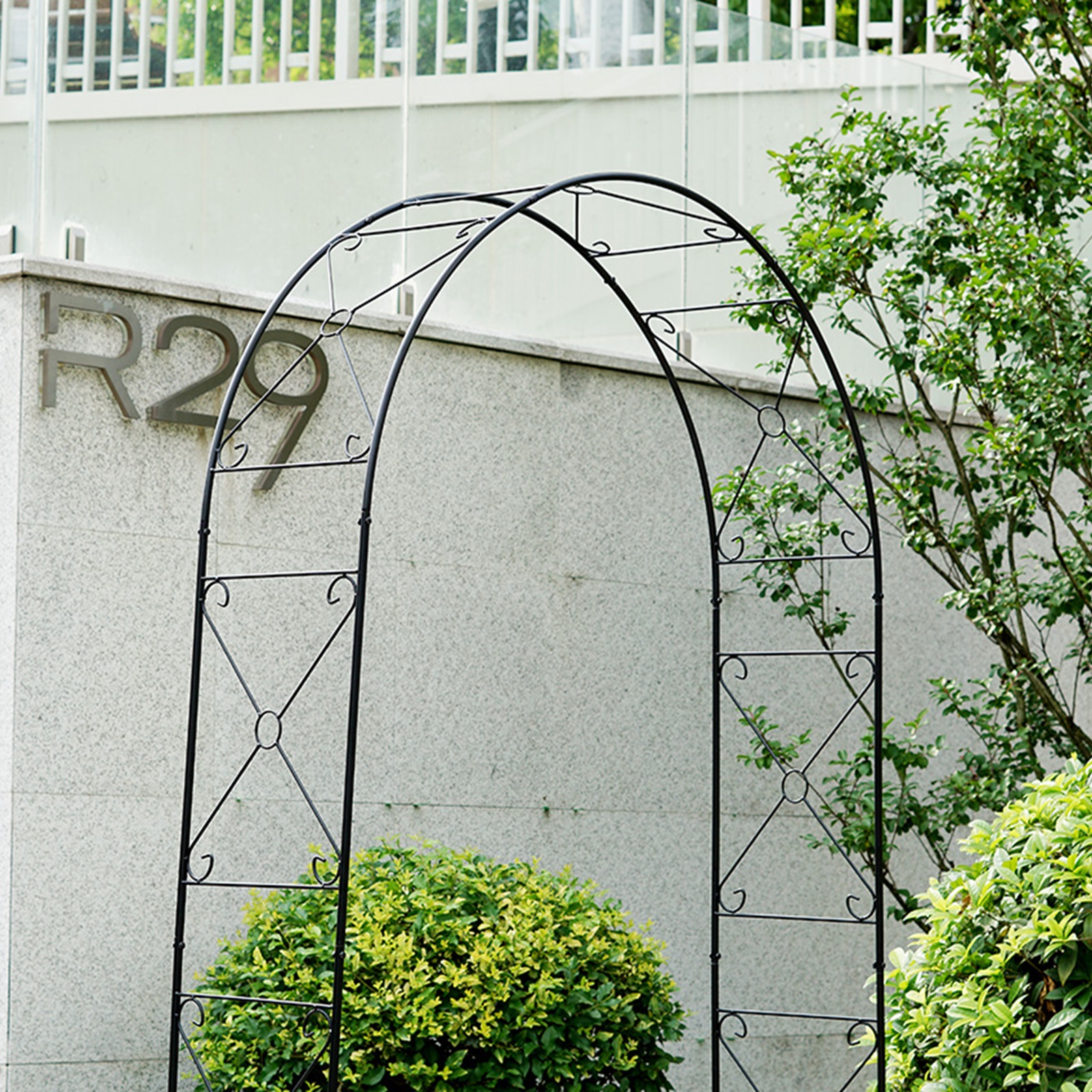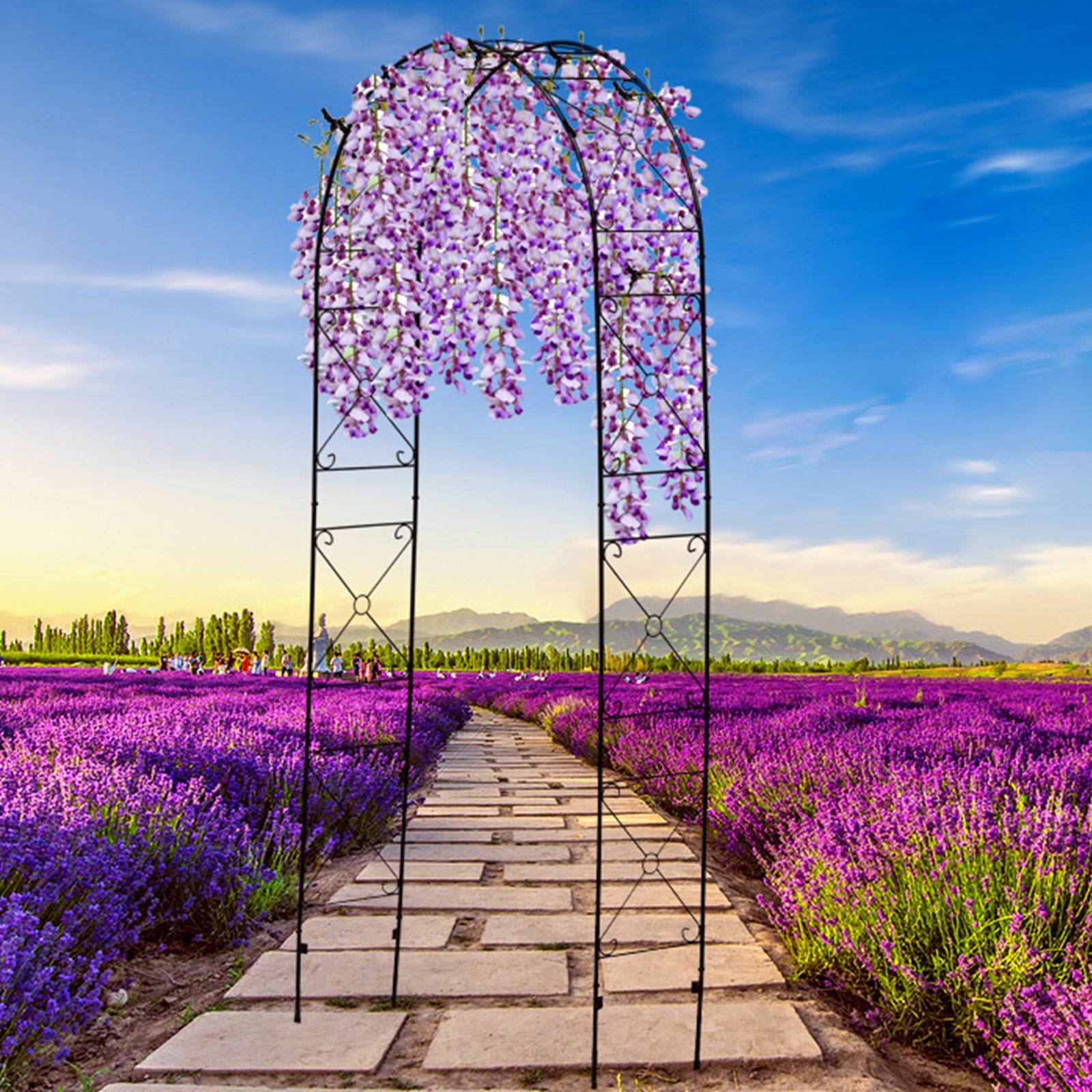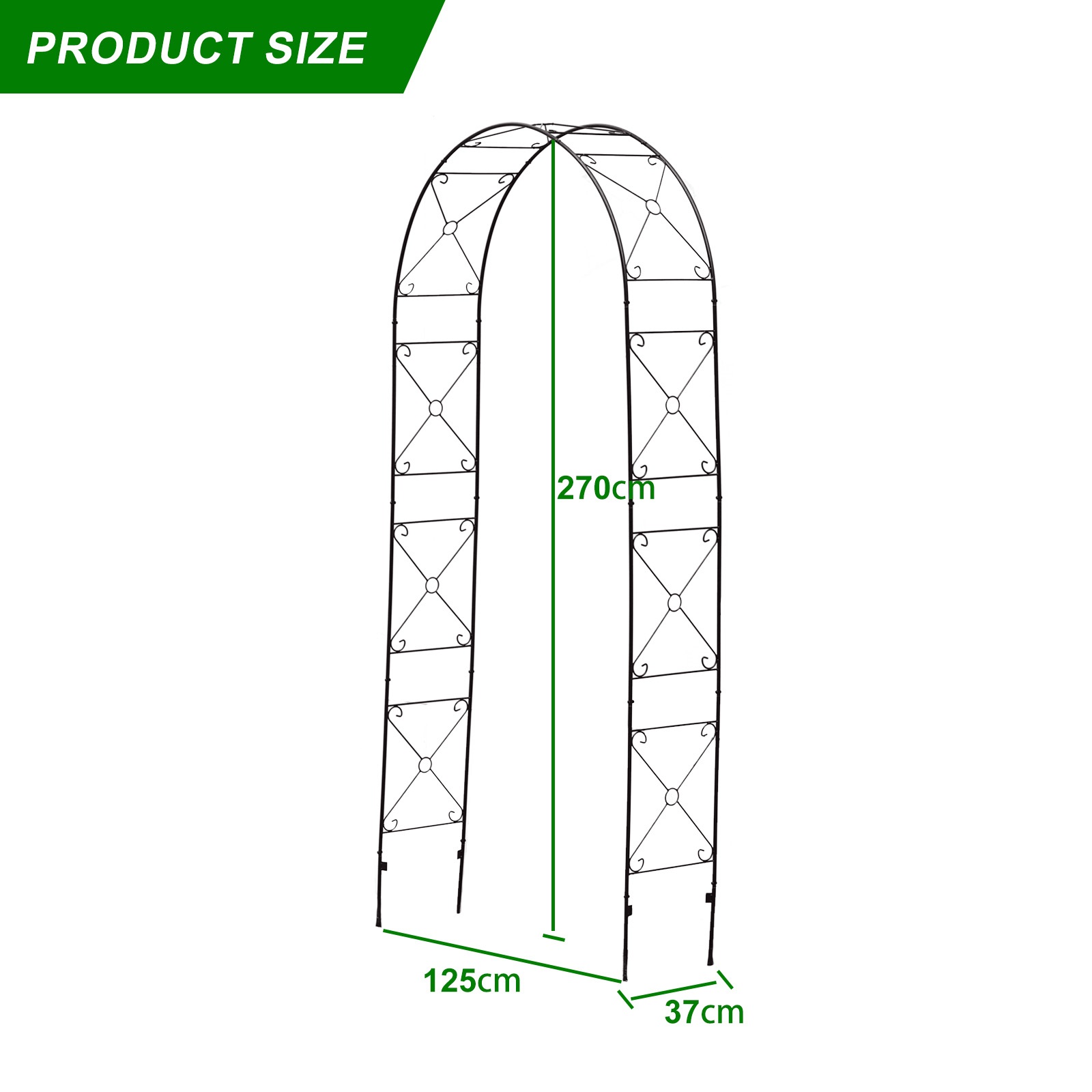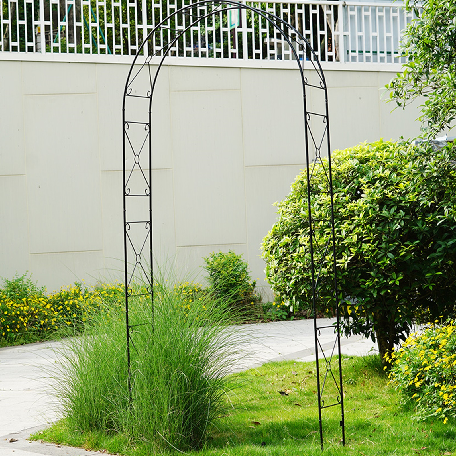 The metal garden arch is constructed of a heavy-duty powder-coated metal frame, which is rustproof, weatherproof, and deformation-resistant, ensuring long-term outdoor use.