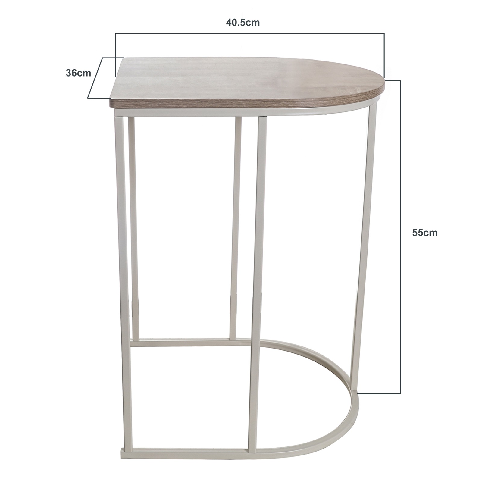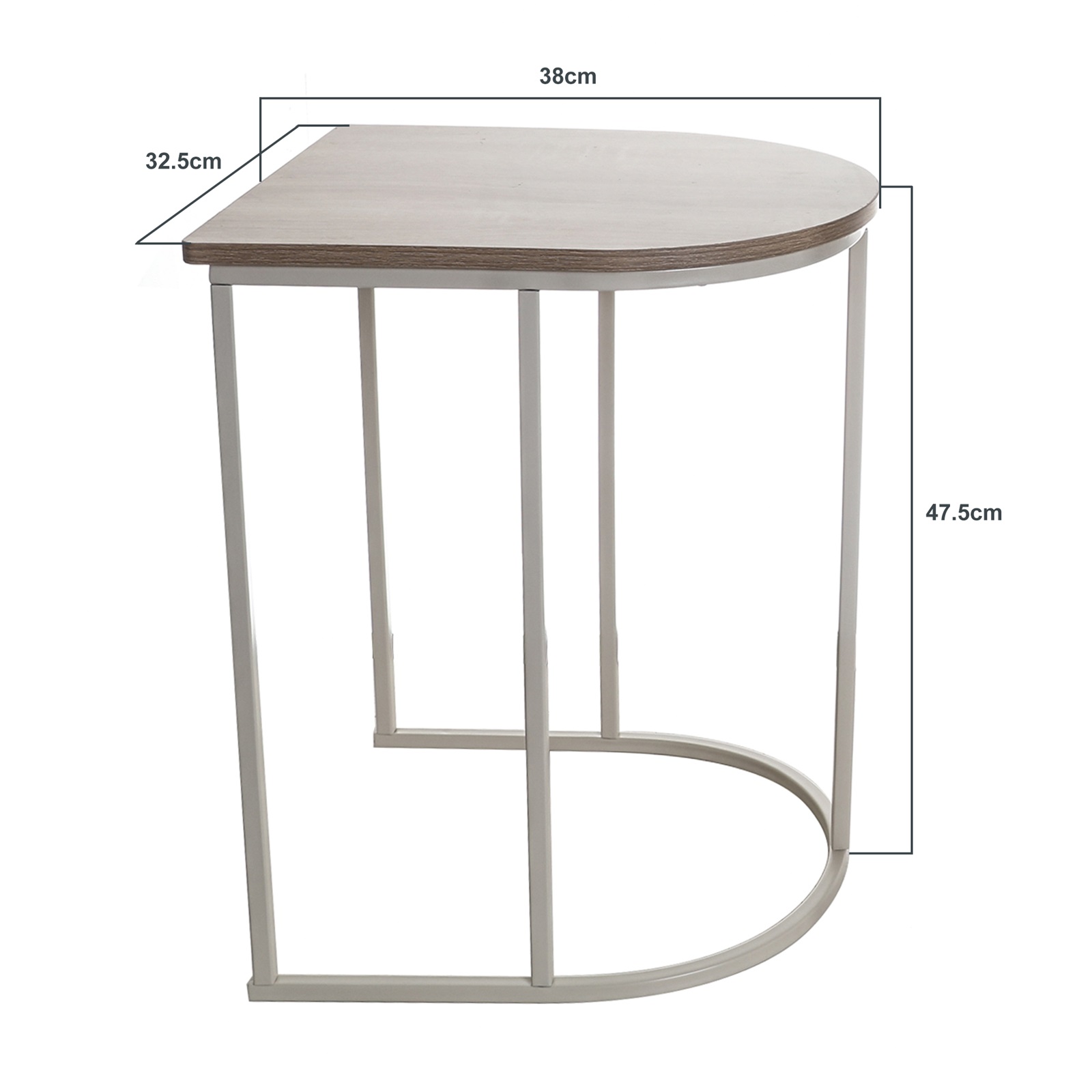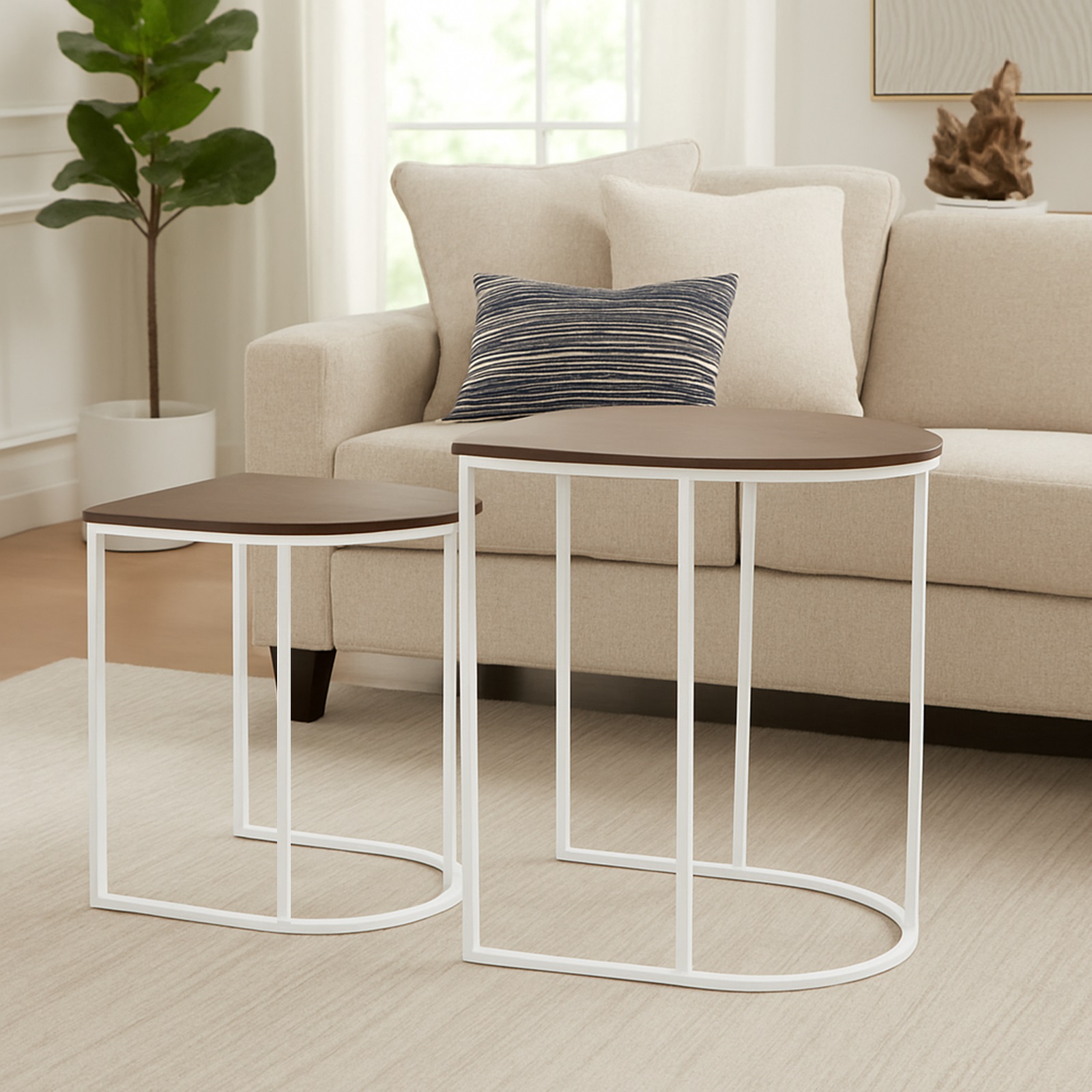 Add a touch of modern elegance to your home with this stylish set of two nesting side tables. Featuring a warm wood-grain table top and sleek white metal frame, these tables combine durability with a minimalist industrial design that fits perfectly into any decor.