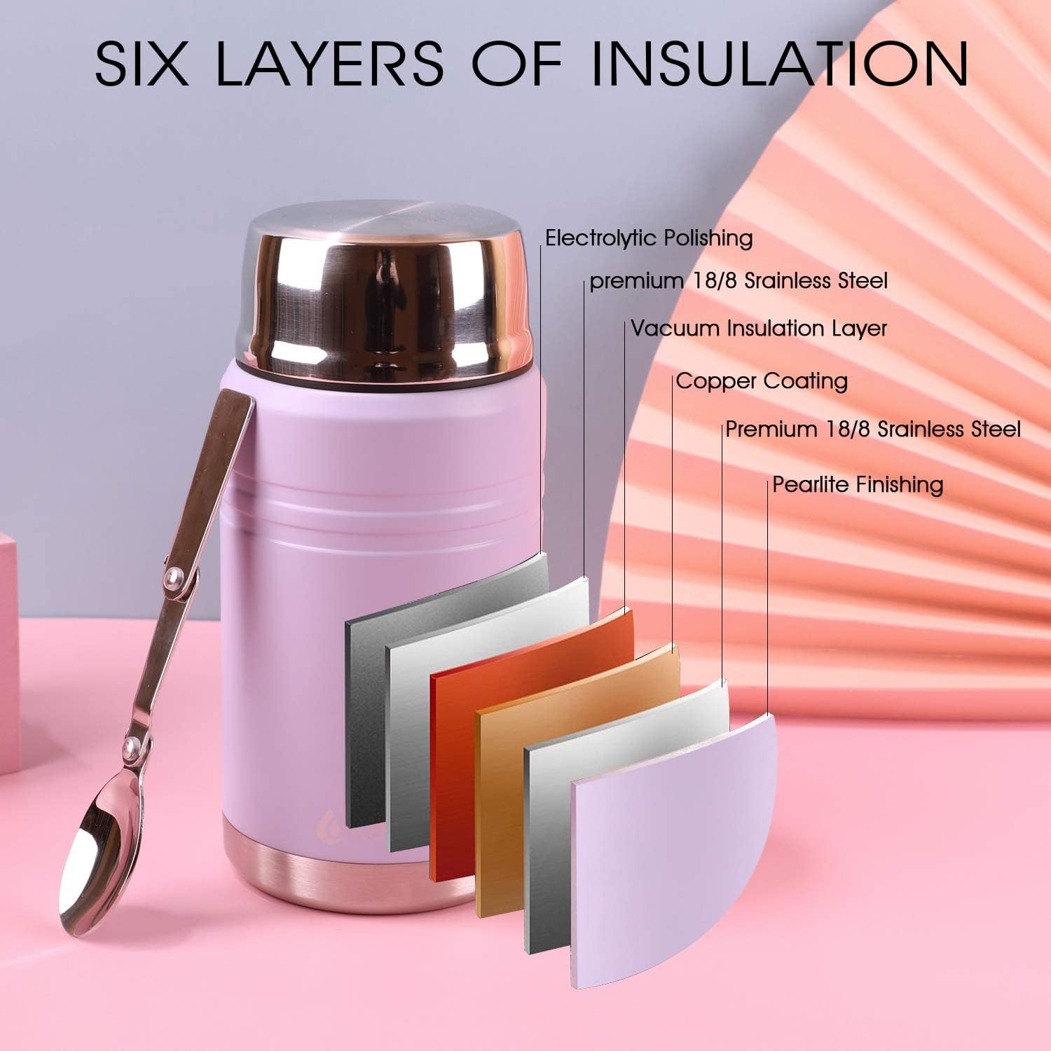 Stainless Steel Food Flask 750ml Vacuum Insulated Thermal Soup Jar Spoon Purple Summary