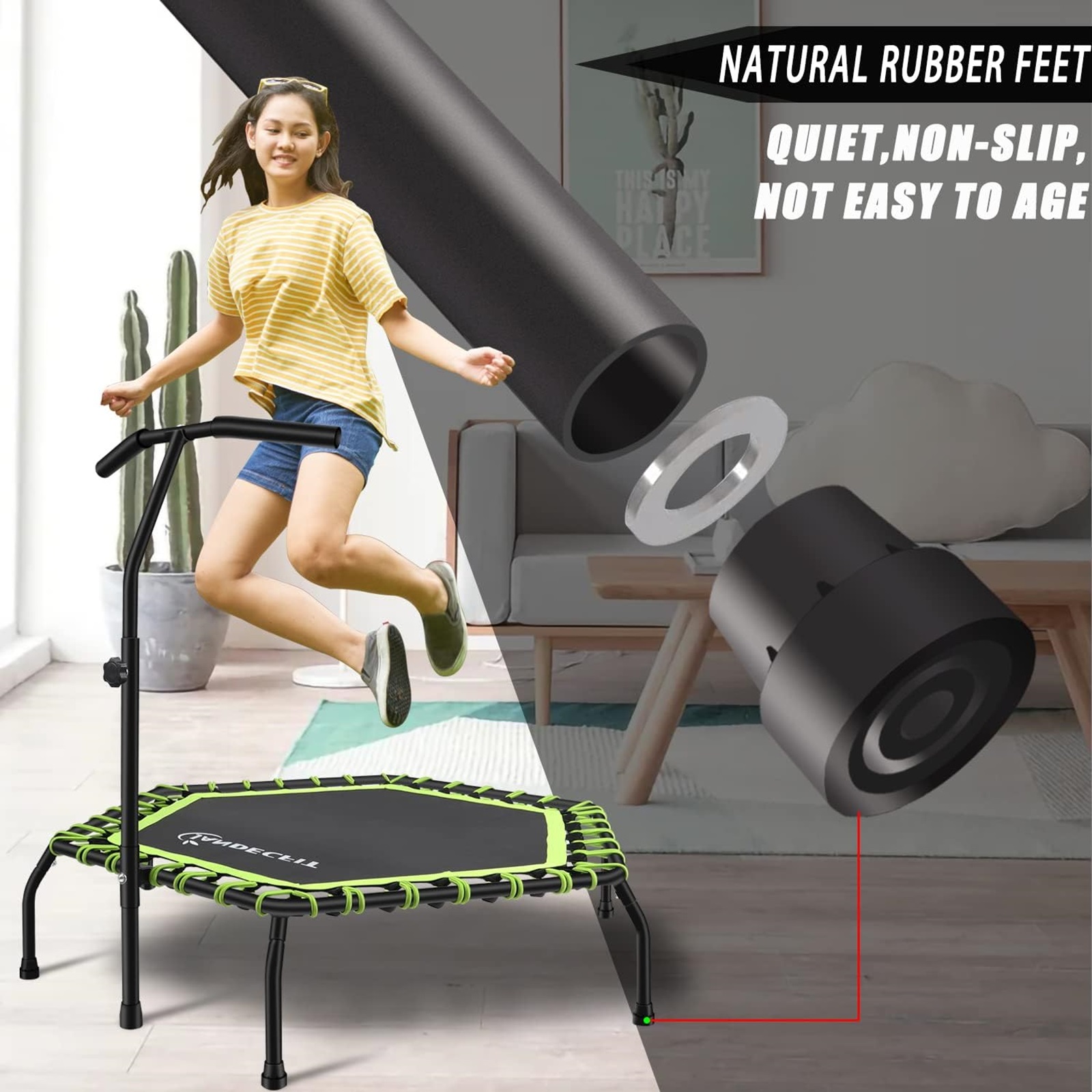 【STABLE ARCHED FOOT DESIGN The unique arched foot design features of the exercise trampoline for adults make the trampoline stronger, safer, and maximize the stability of the trampoline. Equipped with non-slip rubber pads, it has better grip and can protect the floor and reduce noise.