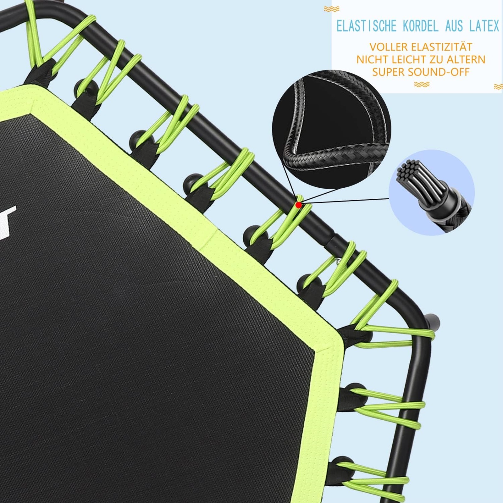 【QUIET EXERCISE】The indoor trampoline uses a bungee cord design, 36 latex bungee cords with a diameter of 0.32 inches (8 mm).While improving the comfort of use, it also achieves the mute effect, Ultra-quiet, forgiving shock absorption, smooth rebound, no squeaks bounce, bring you an excellent jumping experience.