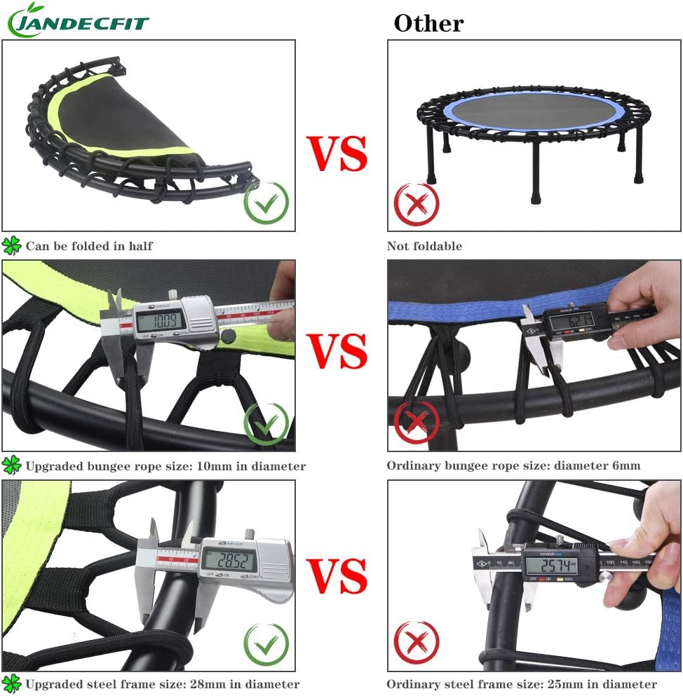 (HALF-FOLDED DESIGN) Jandecfit exercise trampoline for adults adopts a 1/2 folding design, the installation steps are simple and not complicated, just open it and screw it on the foot tube.It can be folded for storage when not in use.Suitable for living room, bedroom, office and other indoor spaces.
